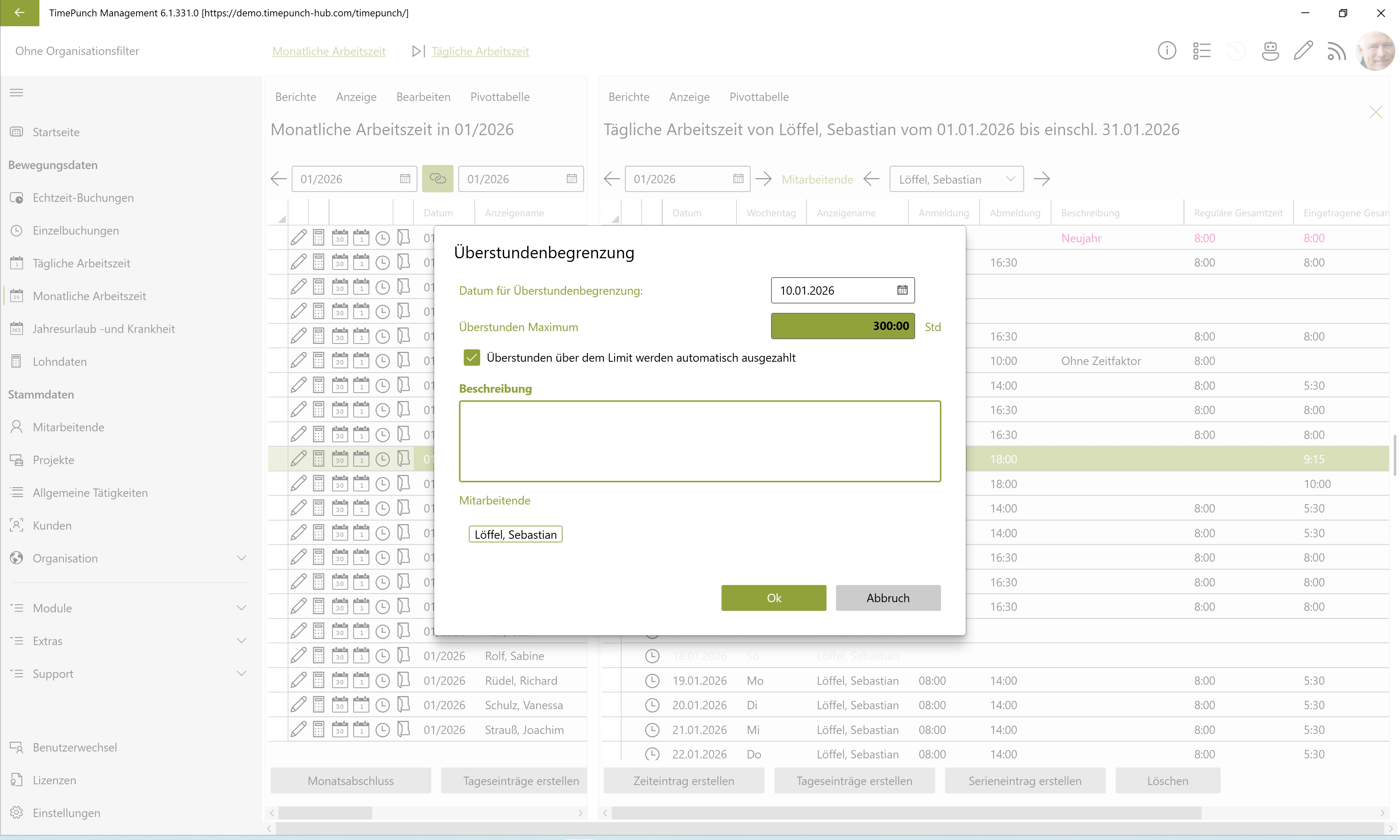 In den Mitarbeiterprofilen werden reguläre Überstundenbegrenzungen sowie Auszahlungen standardmäßig auf monatlicher Basis definiert.