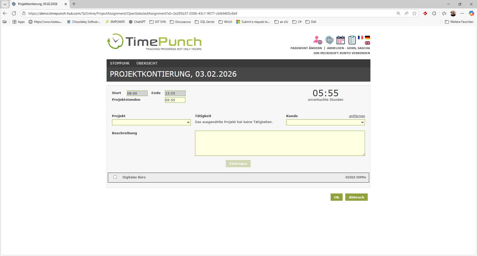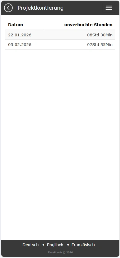 Das Online-Modul von TimePunch unterstützt die nachträgliche Projektkontierung. Das bedeutet: Mitarbeitende müssen nicht sofort einen Projektwechsel durchführen, wenn sie eine neue Tätigkeit beginnen.