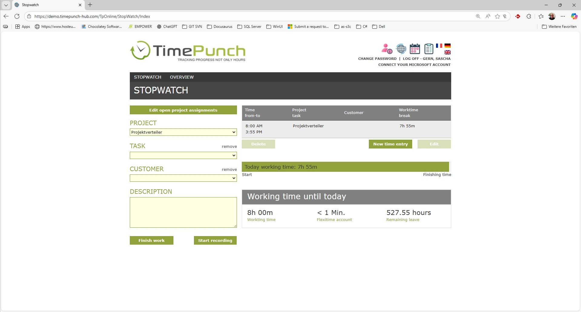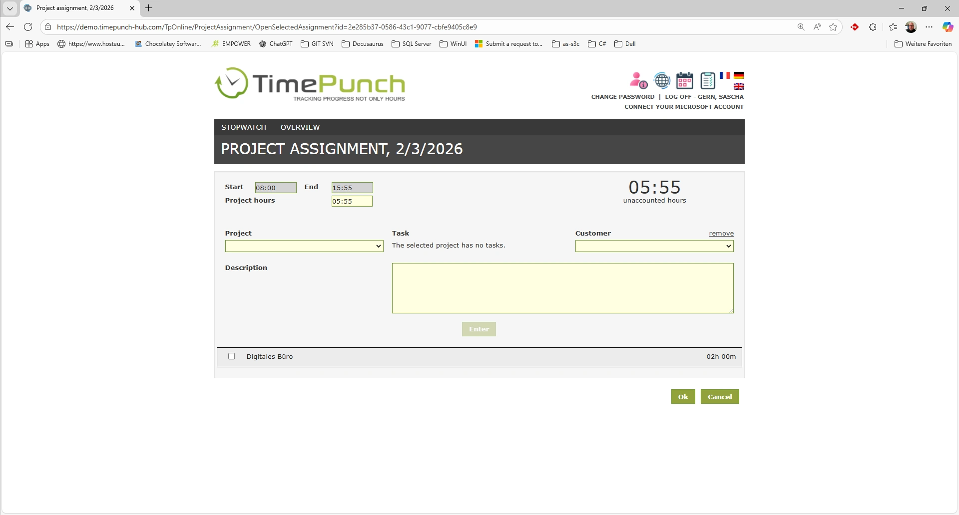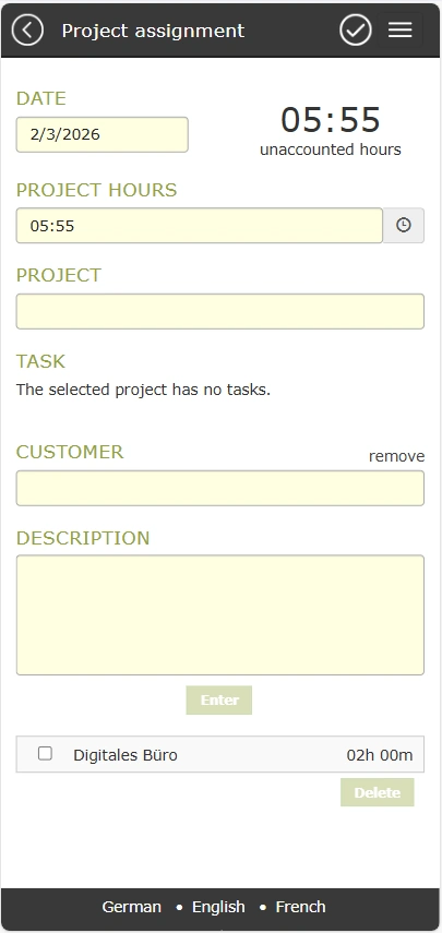 The list of project assigments can be edited by the employee until the project assigment is complete. An existing entry can be opened by clicking on the respective project assigment and can then be adjusted.