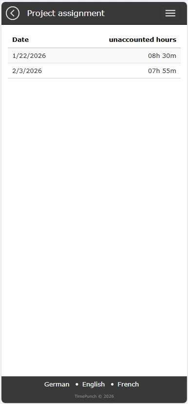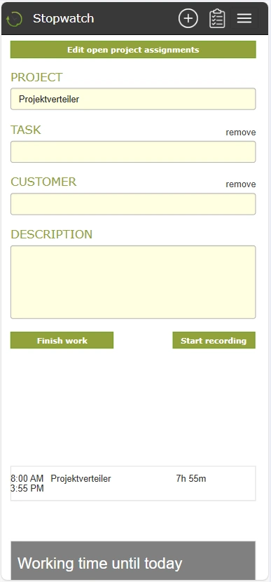 Employees are also allowed to make intra-day project assigments. This distributes the working time recorded so far to different projects without ending the current time recording.