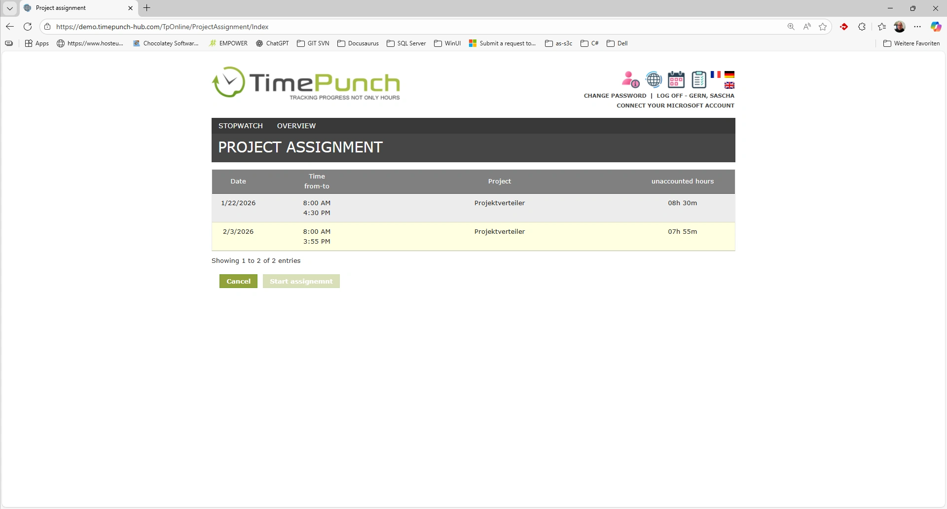 After clicking on this button, a list of all open project assignments is displayed.